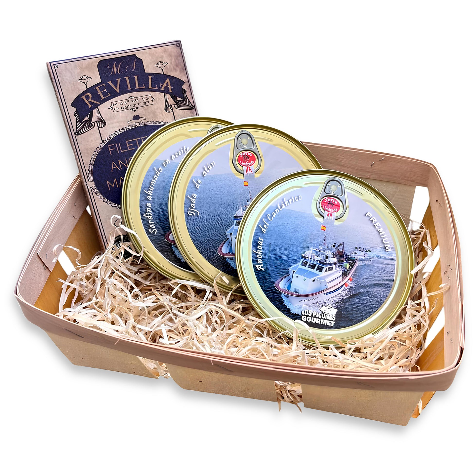 Pack Premium I Cesta Variada Productos Gourmet I Lata Hansa Anchoas Revilla I Ijada de Atún I Sardinas Ahumadas I Anchoas del Cantábrico Premium.