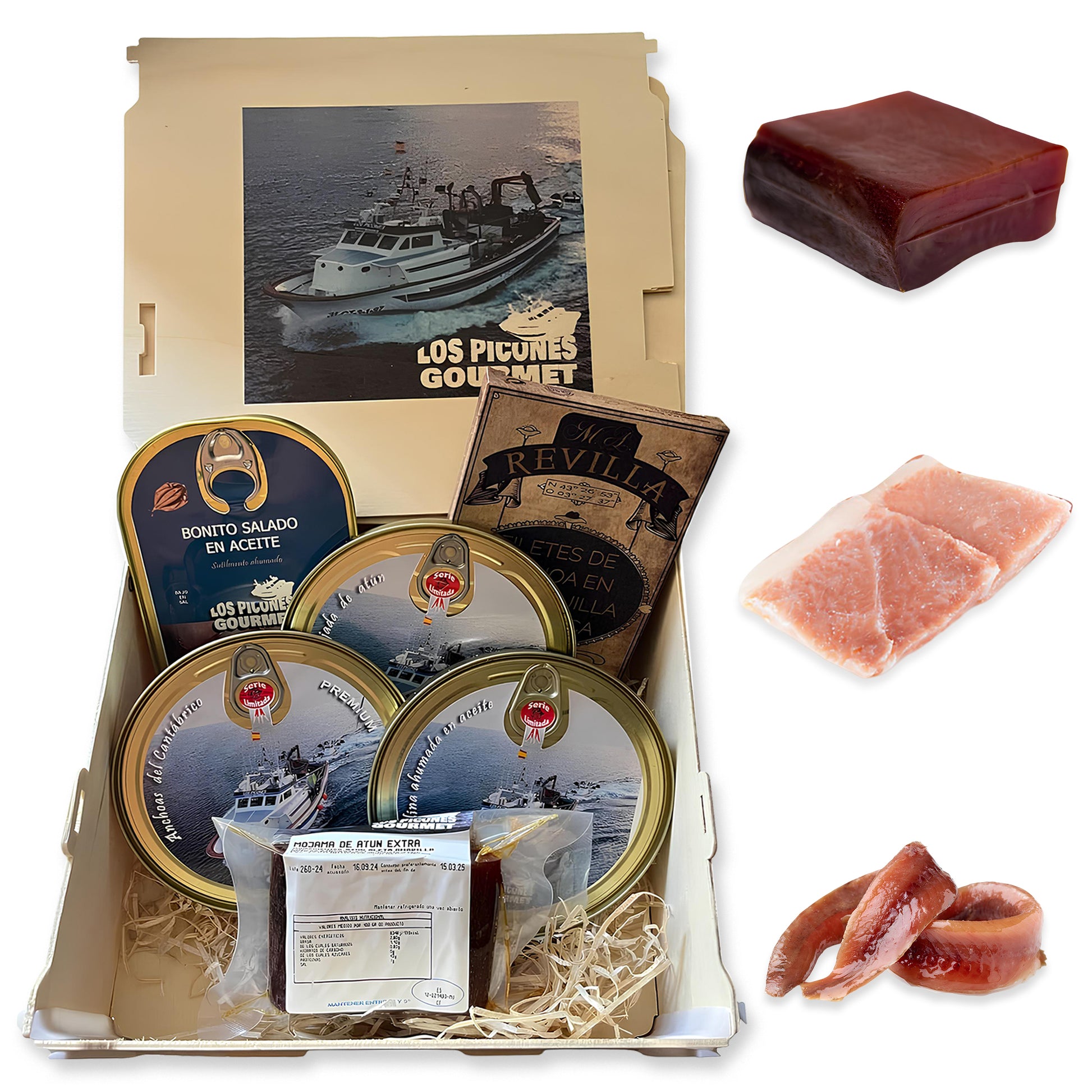 Pack Variado I Ijada de Atún I Sardina Ahumada I Anchoas del Cantábrico I Lata Hansa Anchoas Revilla I Bonito Salado en Aceite I Mojama de Atún Premium.